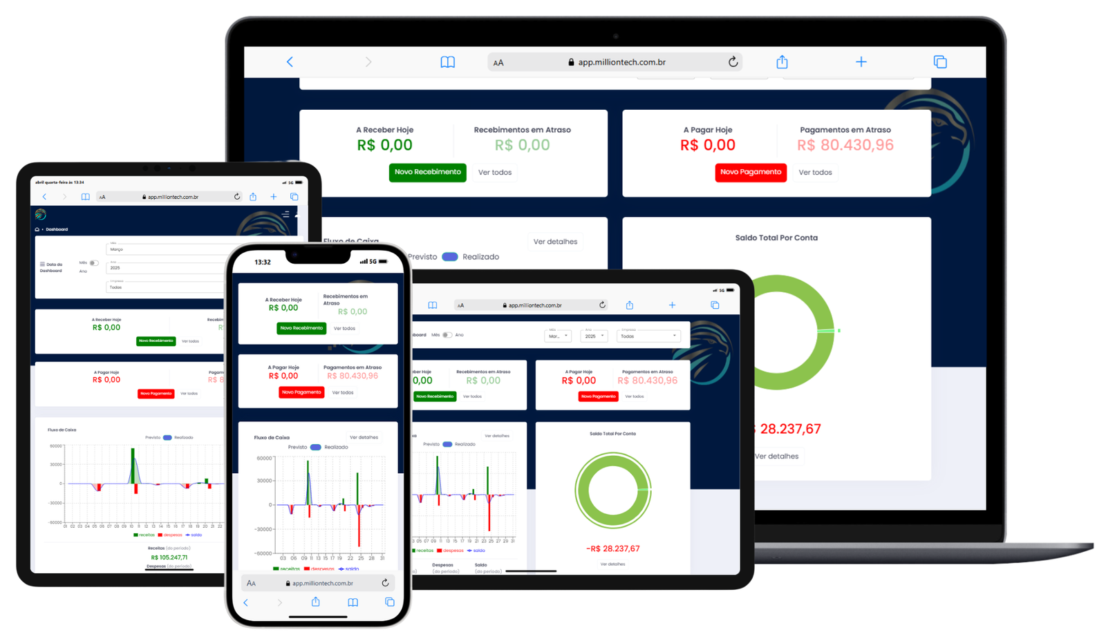 Fluxo de caixa, contas a pagar e receber, Gestão de PDV, Ranking de produtos mais vendidos, Ticket Médio, Vendas por período, Calendário de lançamentos e eventos, Saldo total por conta bancária e muito mais.